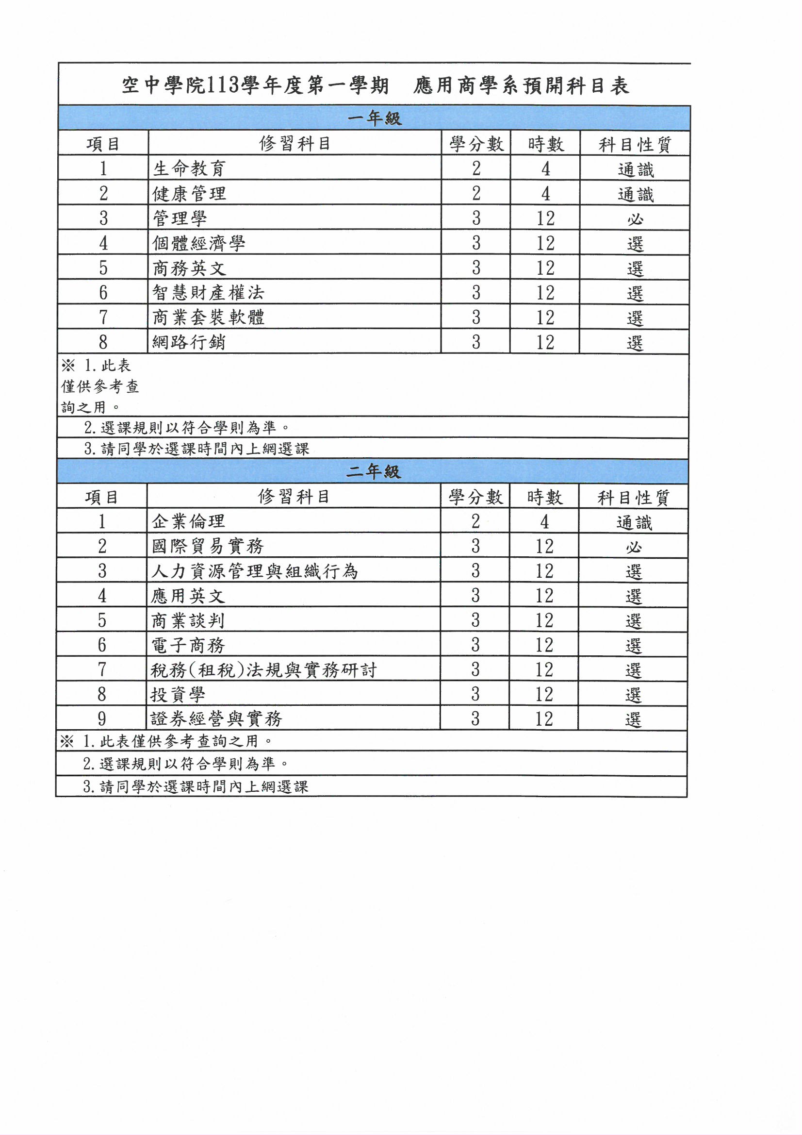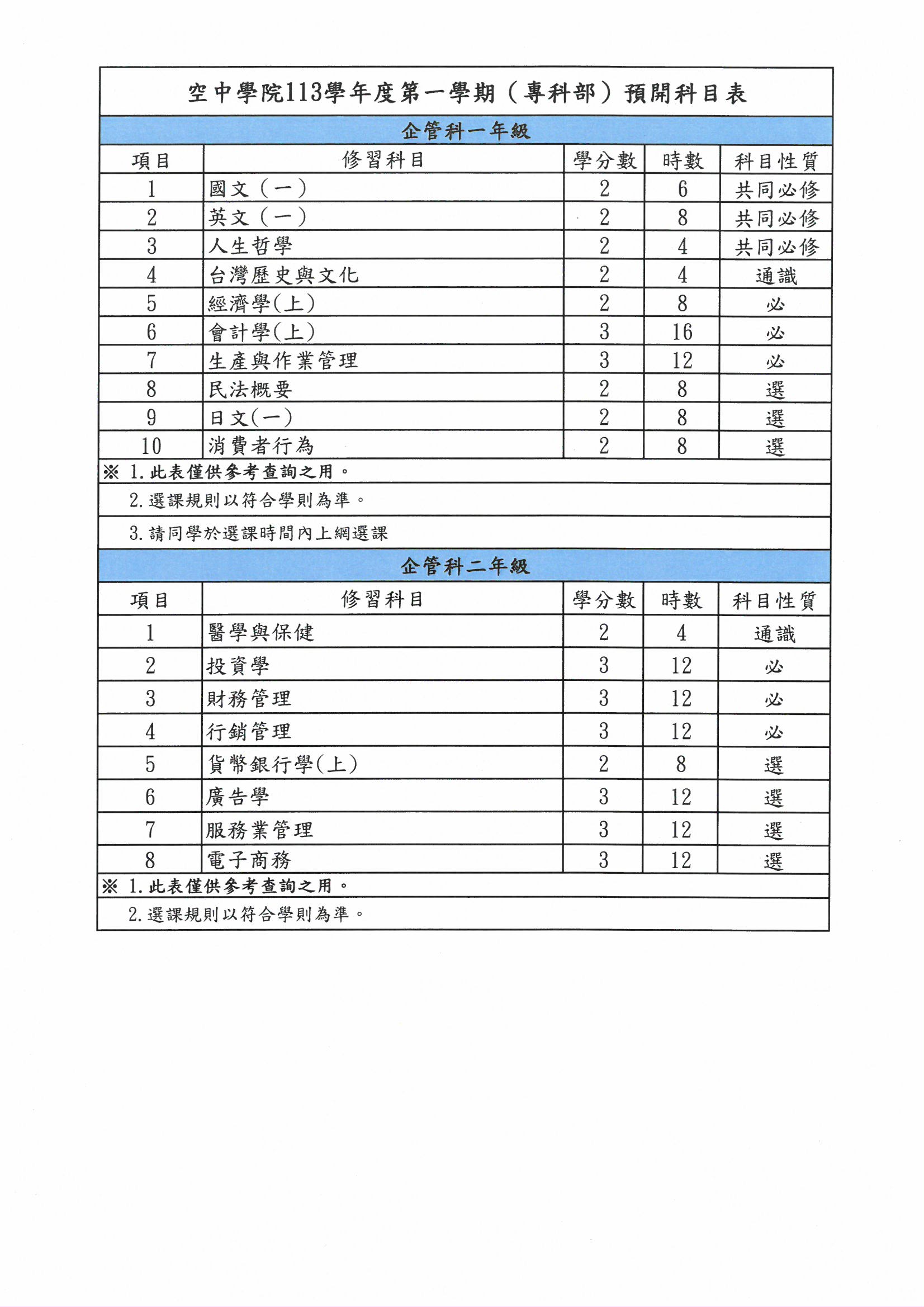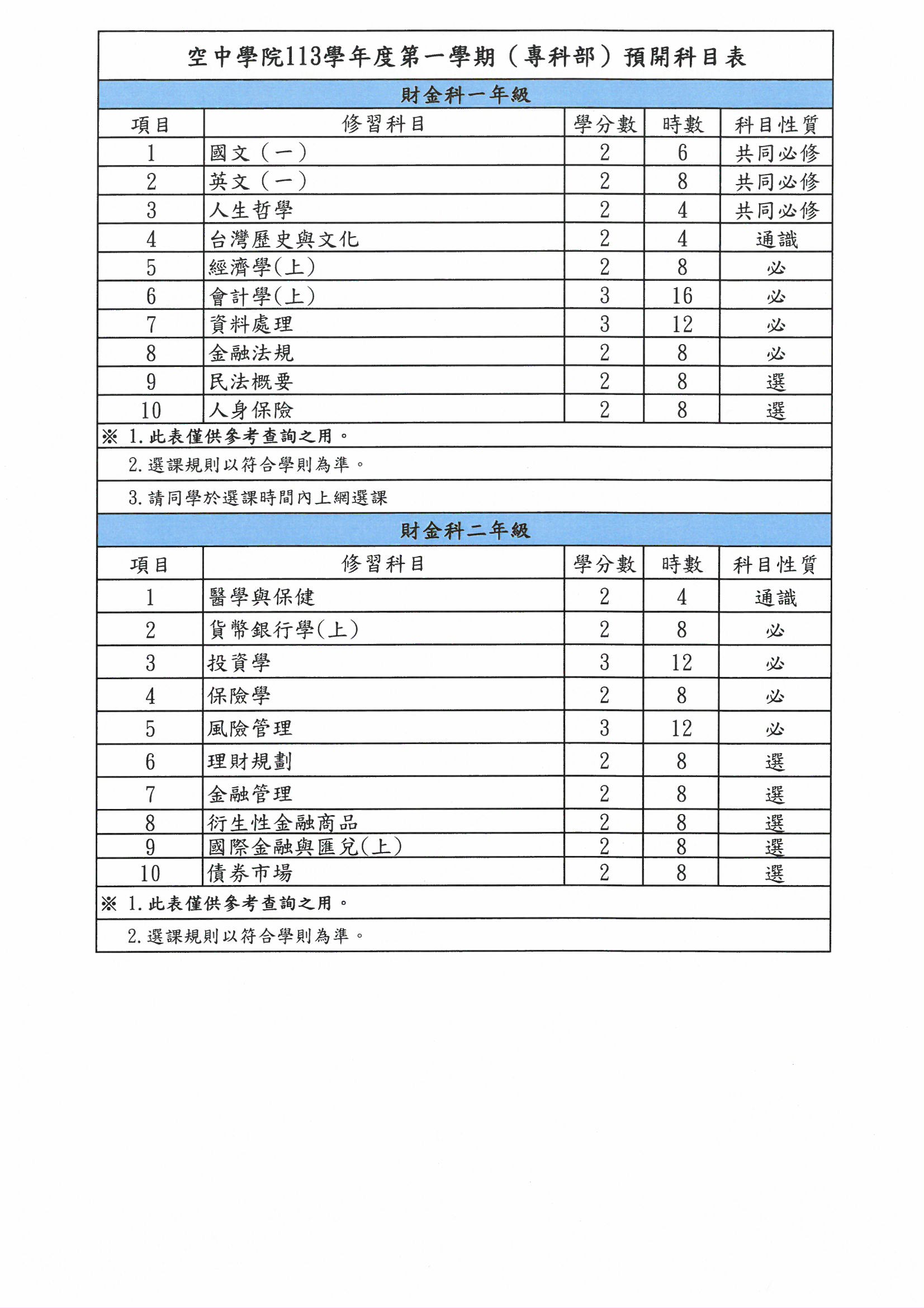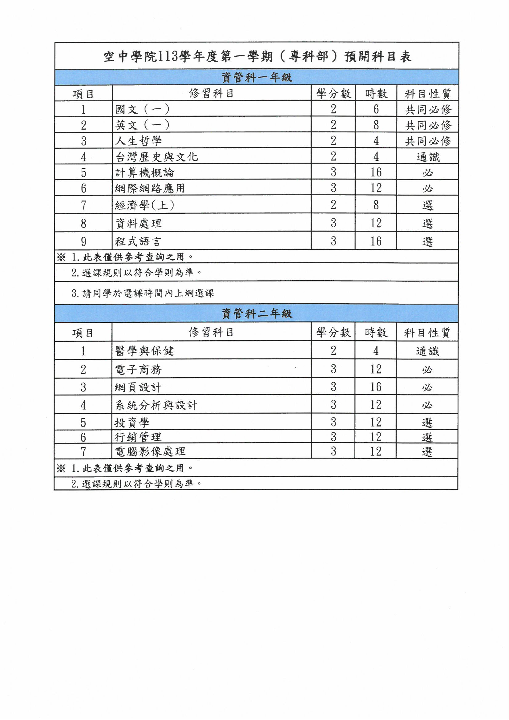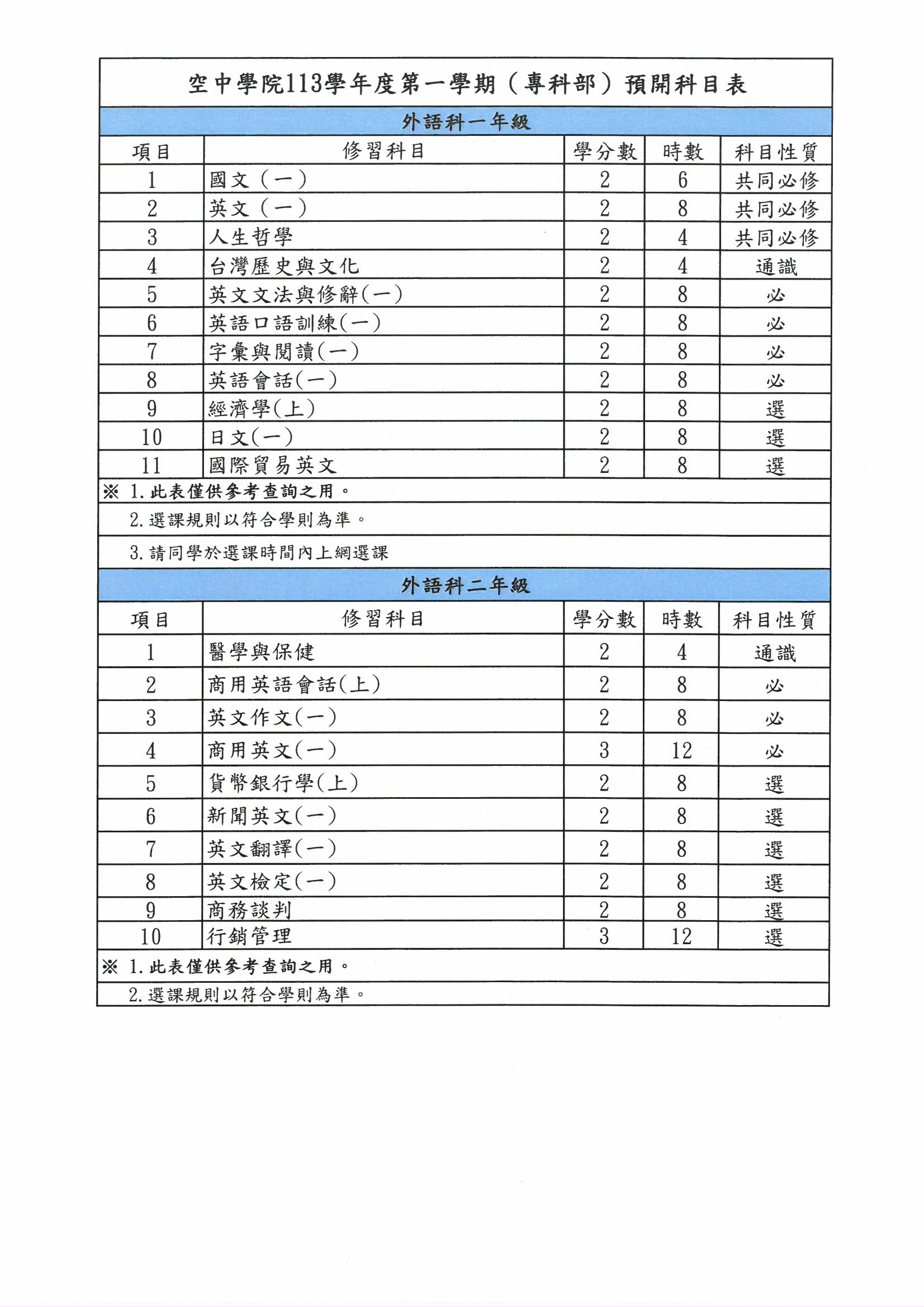 【課務組公告】113學年度第一學期學院部暨專科部預開科目表